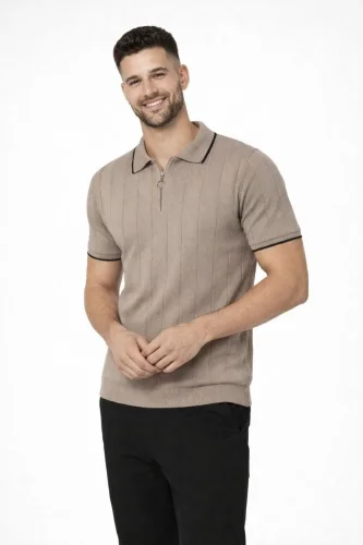 Erkek 3lü Paket Dokuma Triko  Fermuarlı Yakalı Fitilli Kısa Kollu Regular Fit Tişört Kahverengi Beyaz Siyah