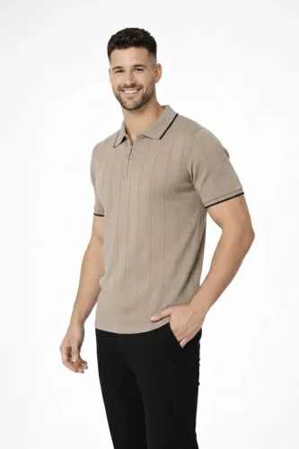 • Erkek 3lü Paket Dokuma Triko  Fermuarlı Yakalı Fitilli Kısa Kollu Regular Fit Tişört Kahverengi Beyaz Bej