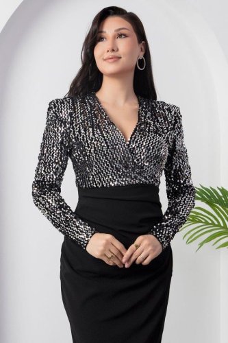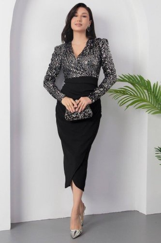 • Kadın uzun kollu kruvaze yaka pul payet detay midi boy elbise